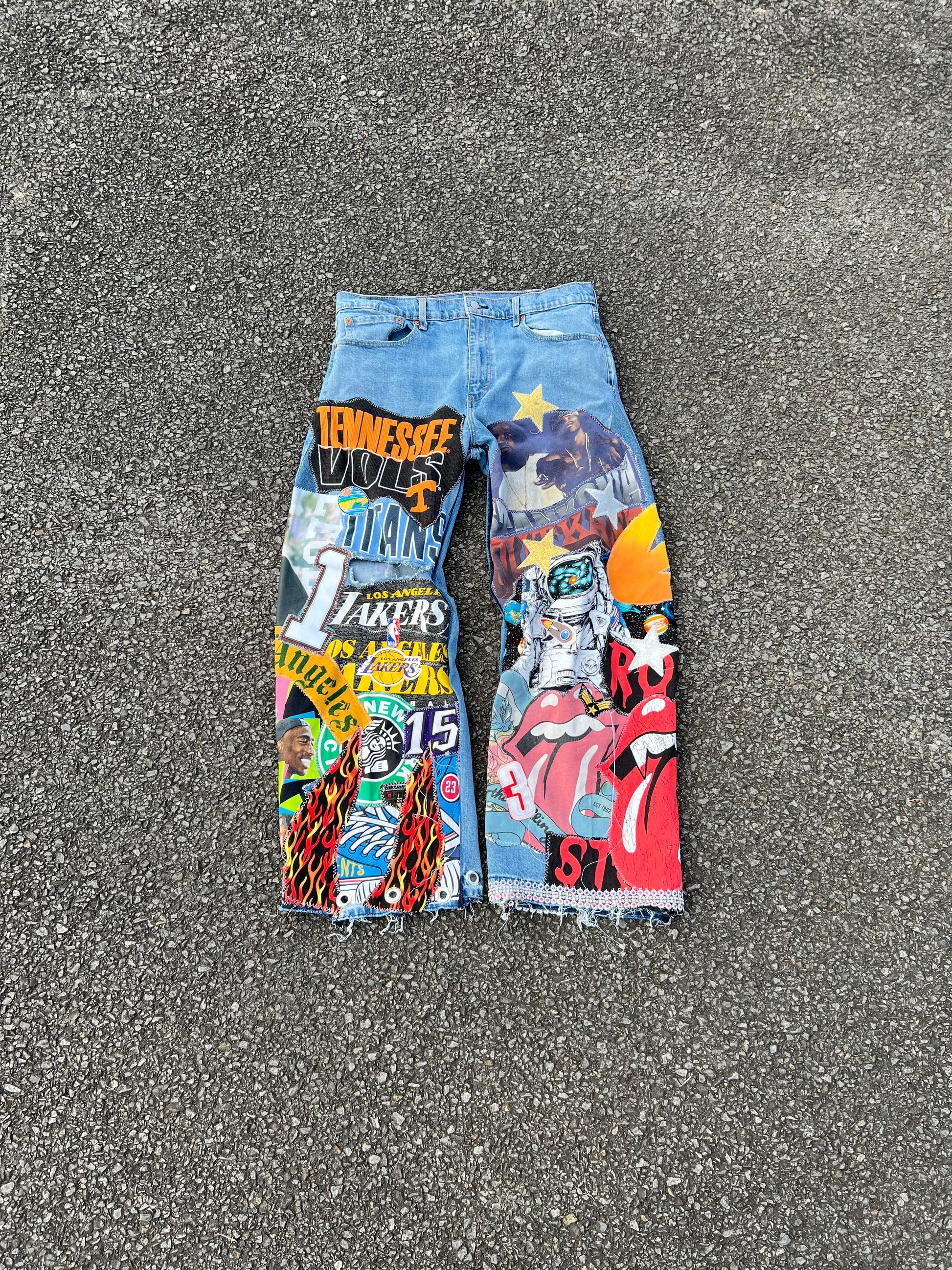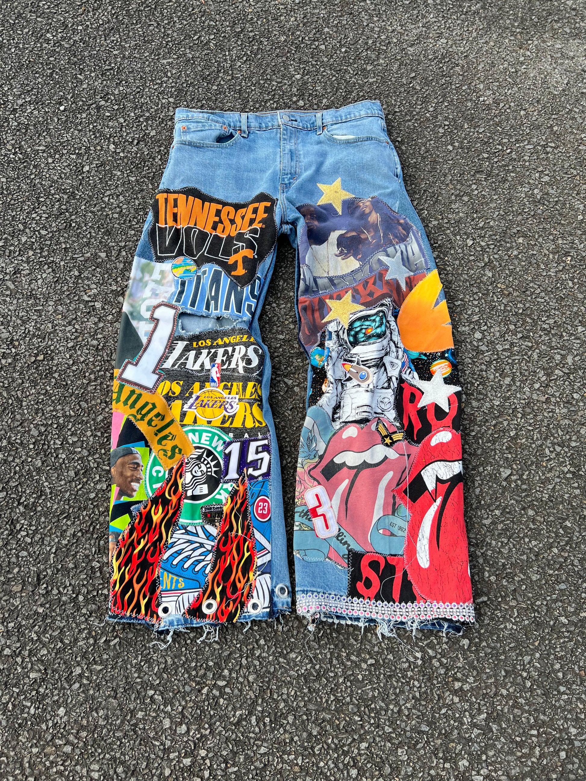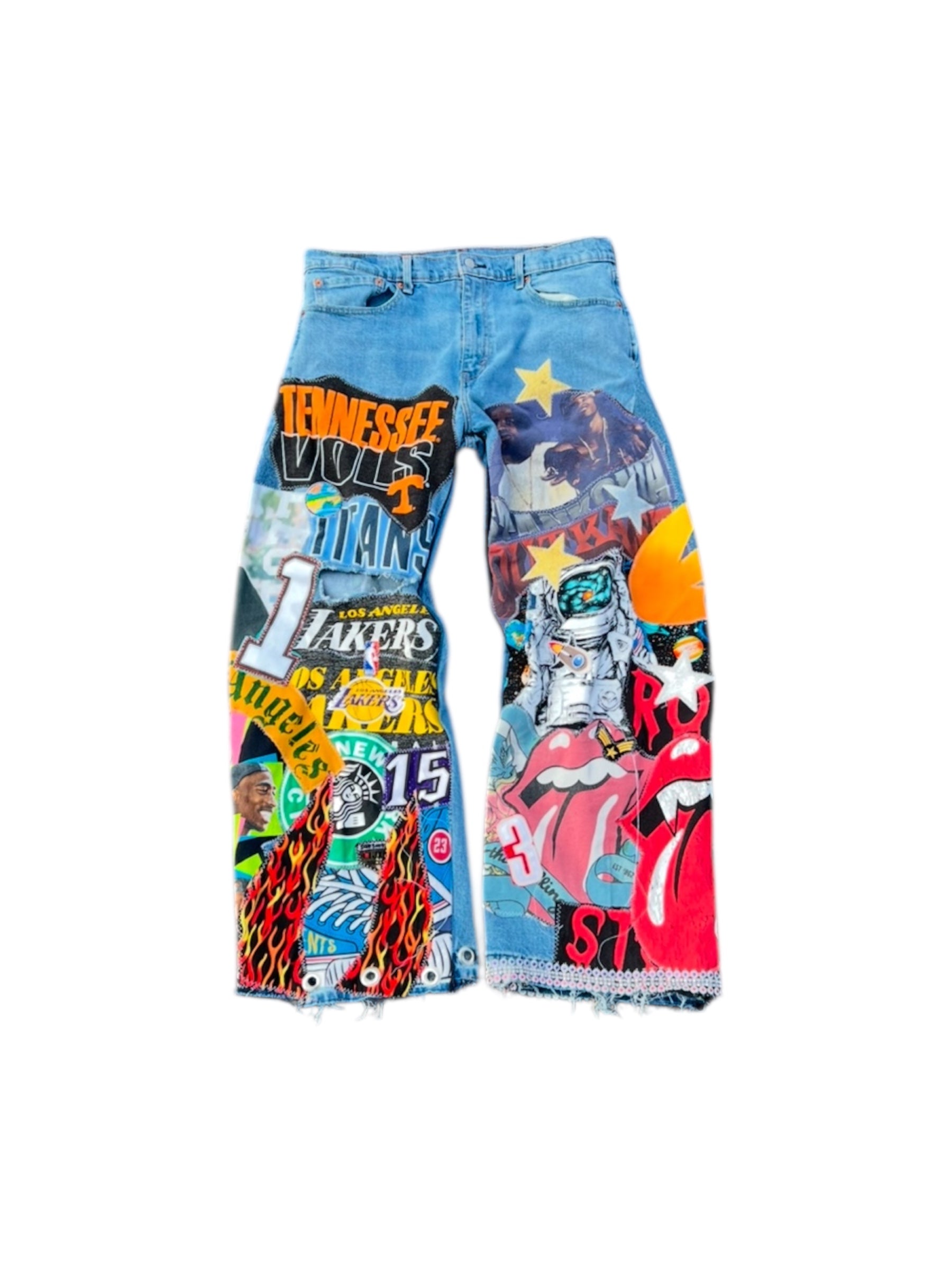 “DENIM CREATED FROM PATCH WORK ITEMS BASED AROUND SPORTS, ANIMIE, MOVIES, HIP-HOP, POP & PUNK ROCK CULTURE. JEWLS & OTHER EMBELLISHMENTS. DENIM VARYS IN STYLES FROM STRAIGHT LEG, FLARED, & BAGGY