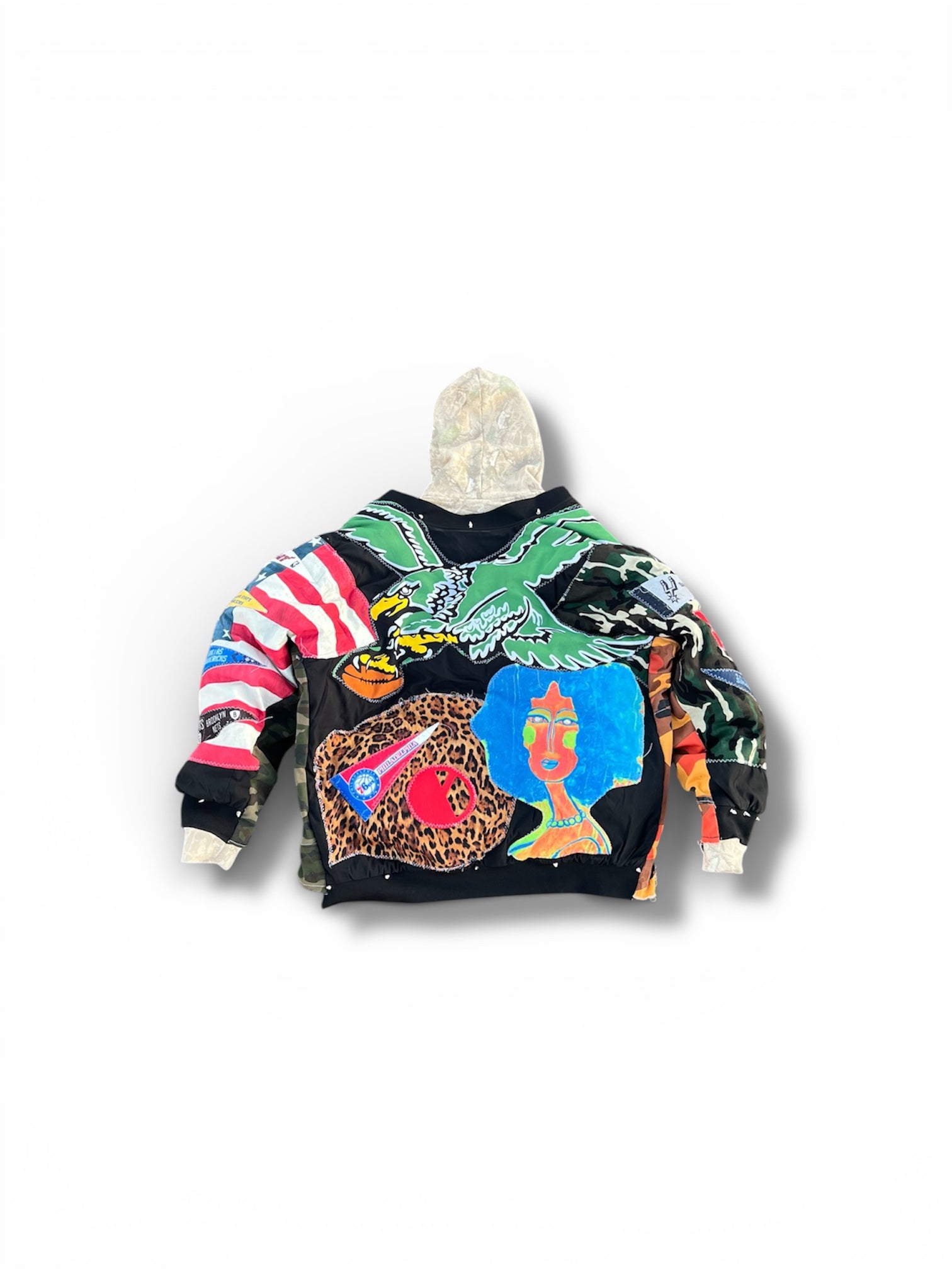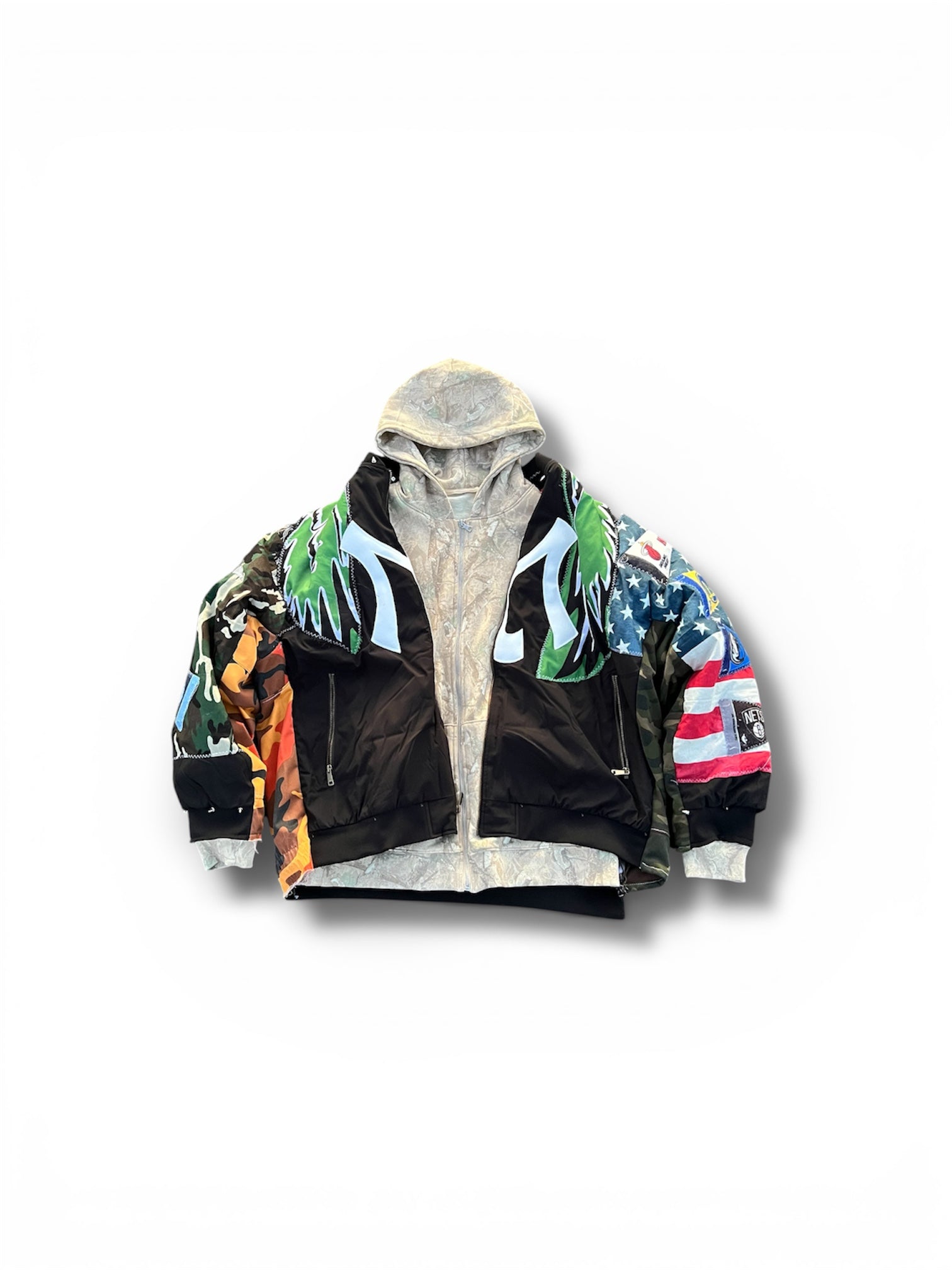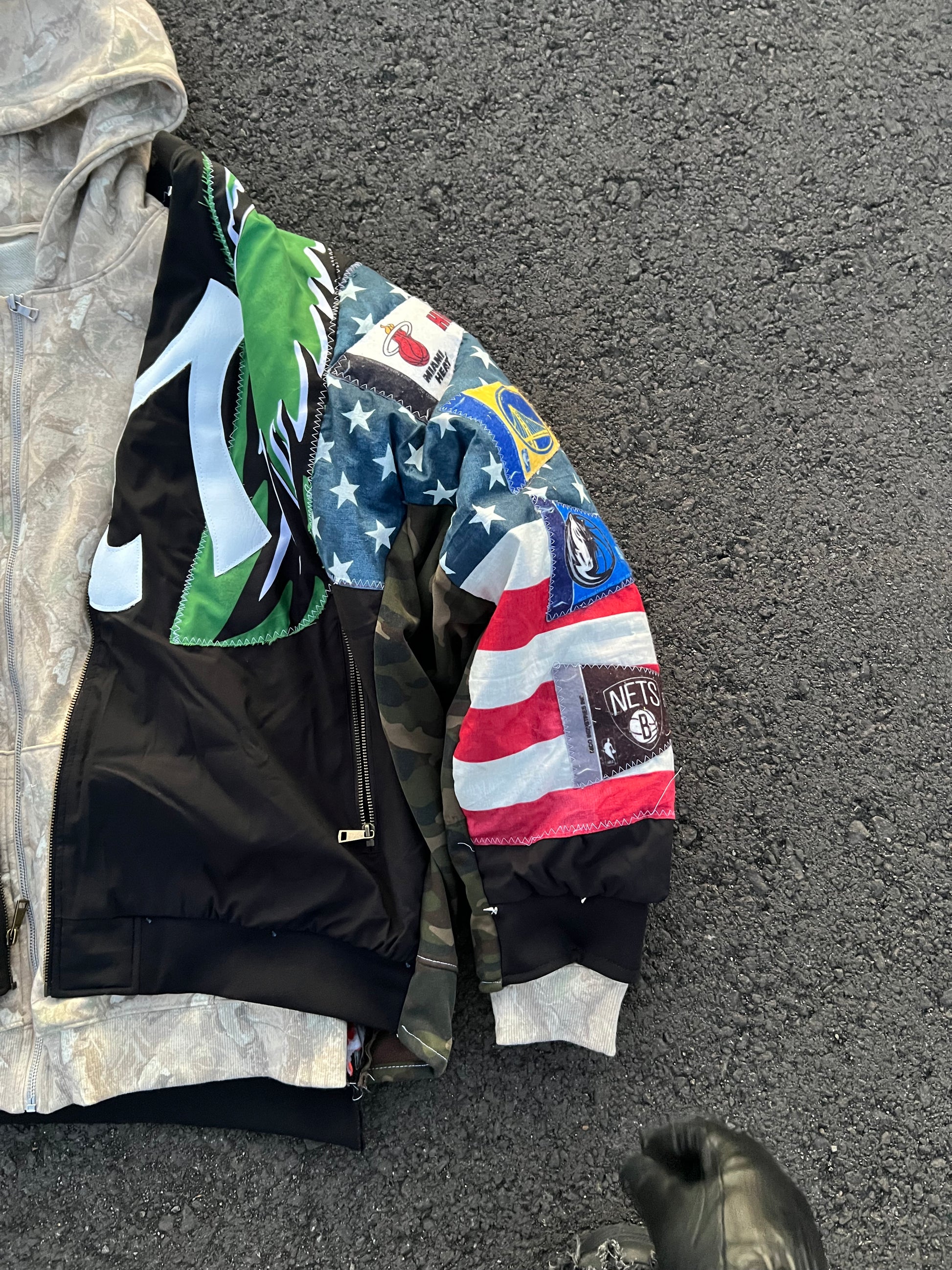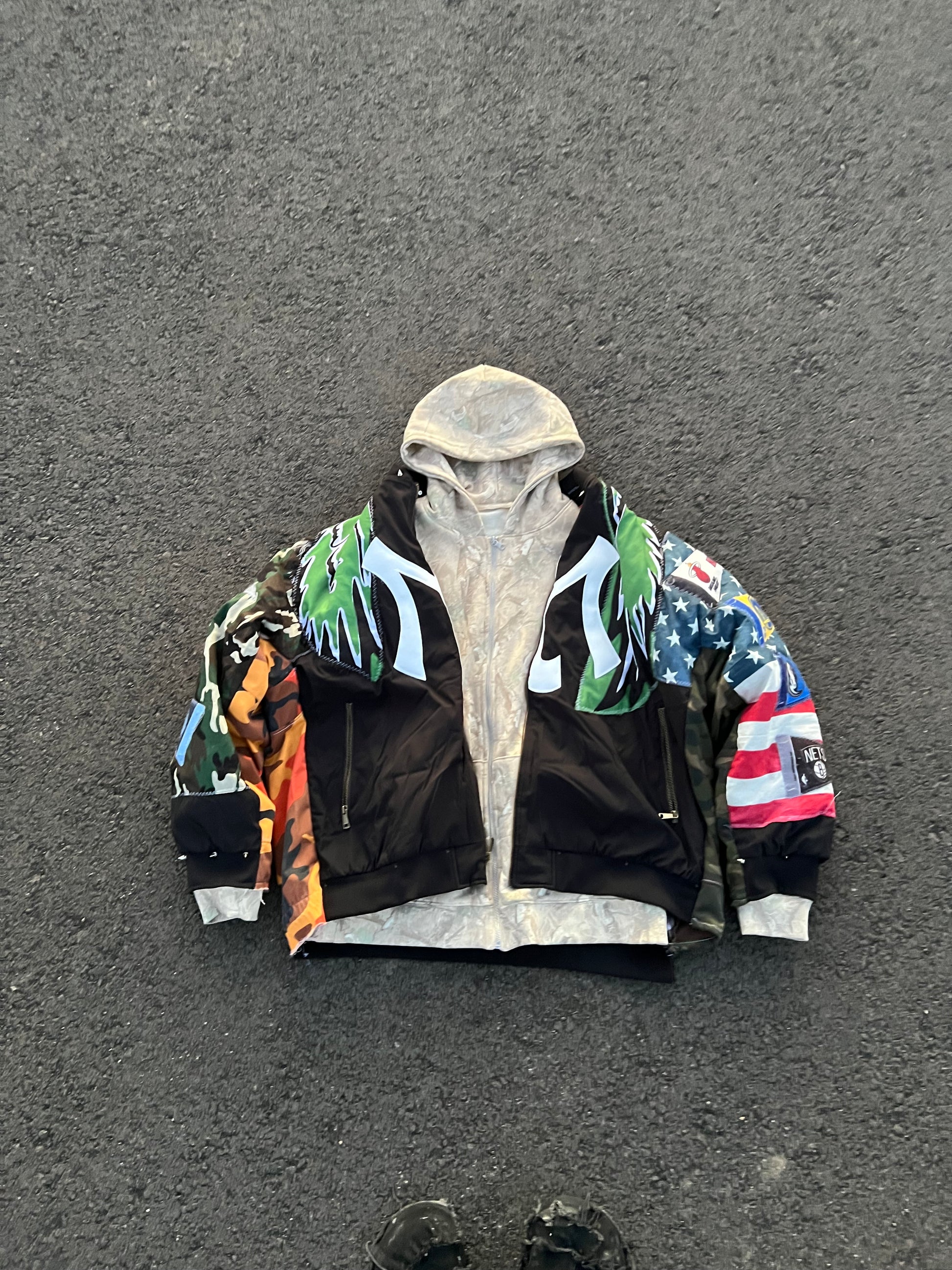 This one-of-one jacket is created by deconstructing a hoodie and a bomber jacket, then sewing them together into a single hybrid silhouette. The piece is finished with layered patchwork applied across the bomber body,