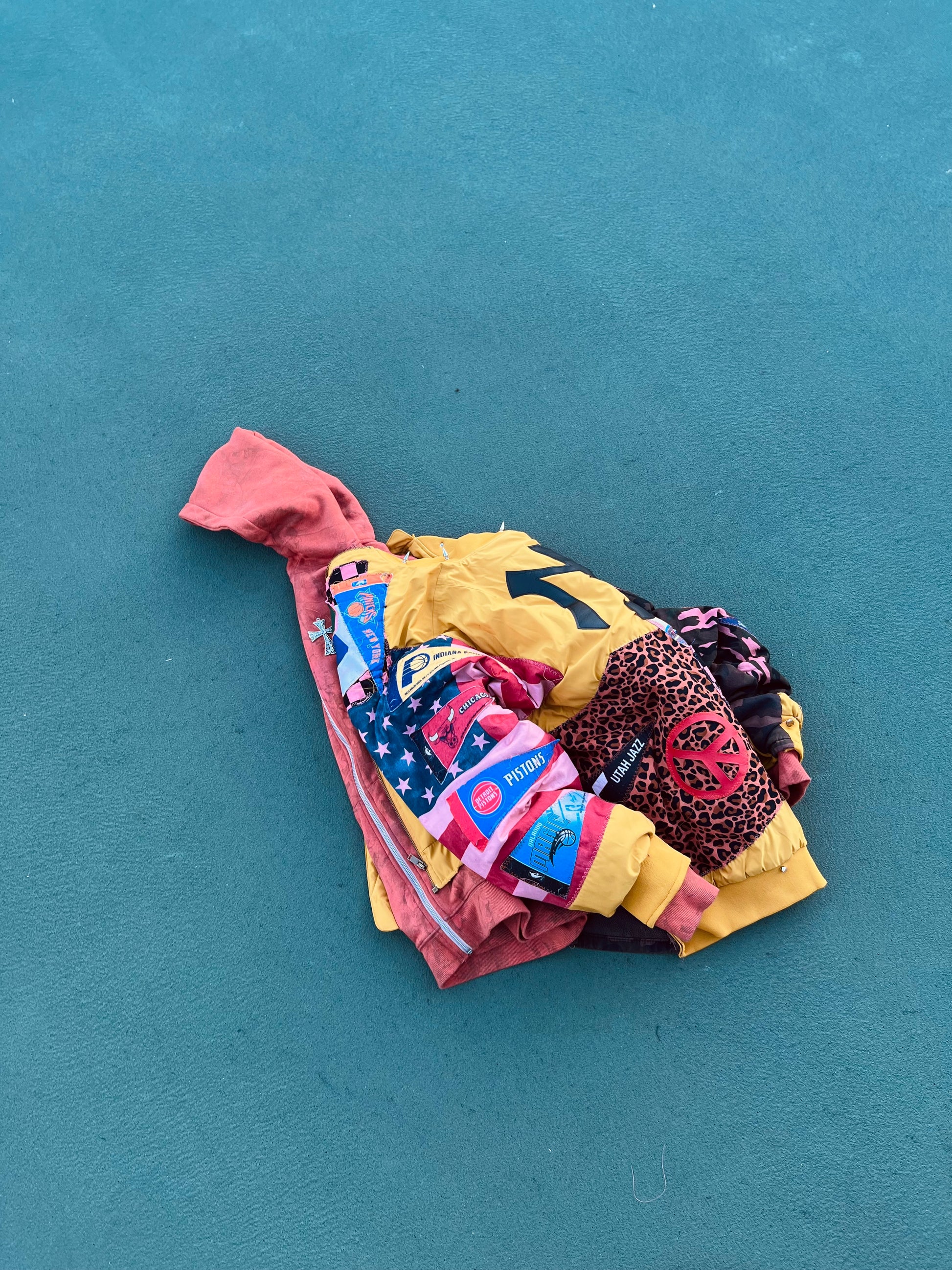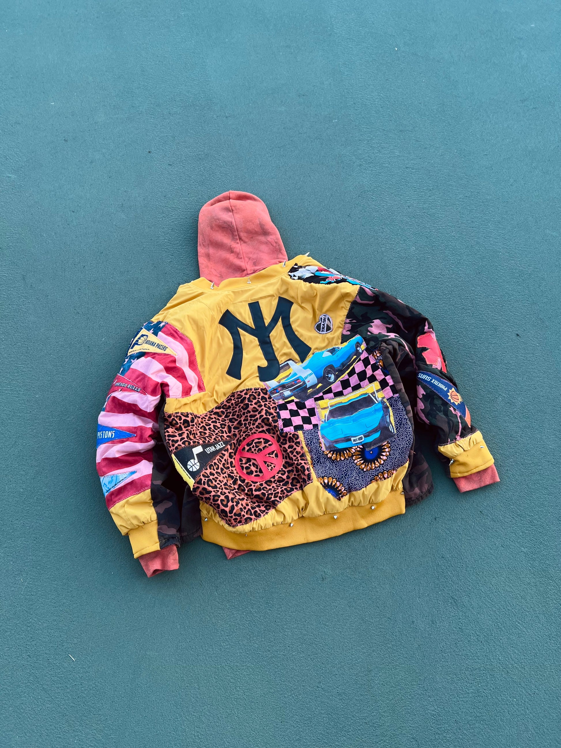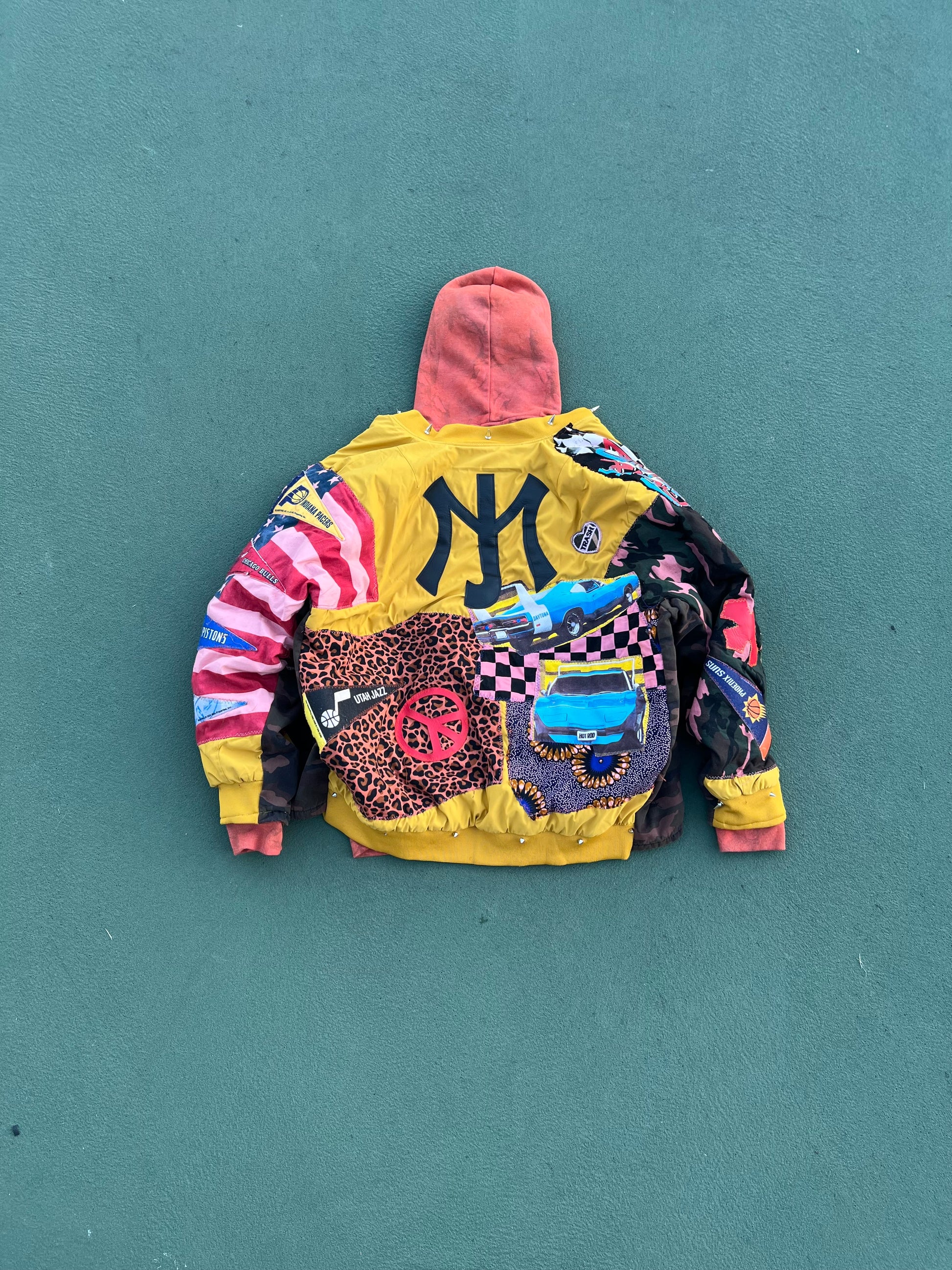 Each panel, fabric, and graphic is intentionally placed. The contrast between the hooded top and structured bomber creates a bold, oversized form, while the patchwork pulls from street culture, motorsport imagery, camouflage, and graphic iconography. The back of the jacket serves as the main focal point.
