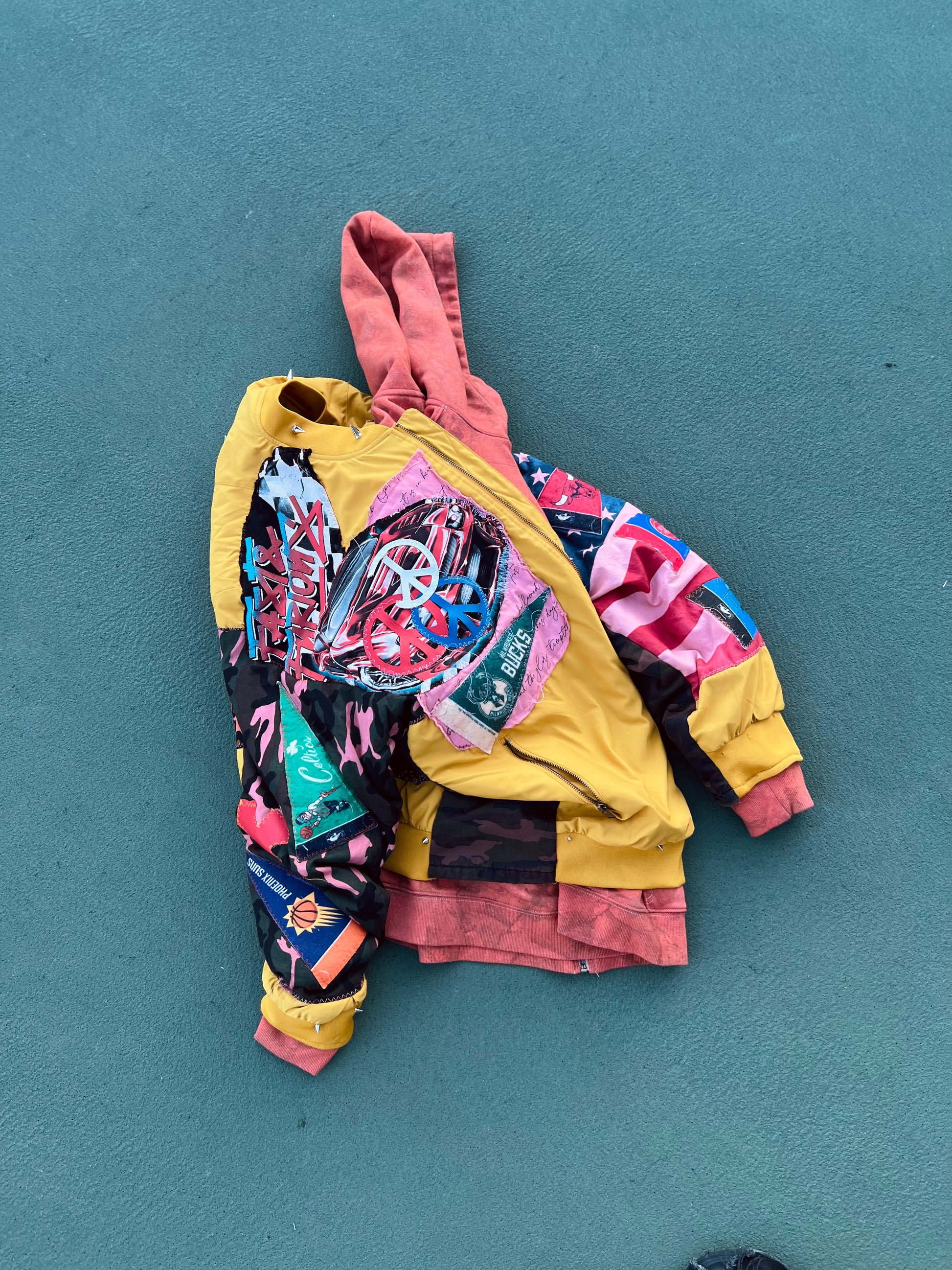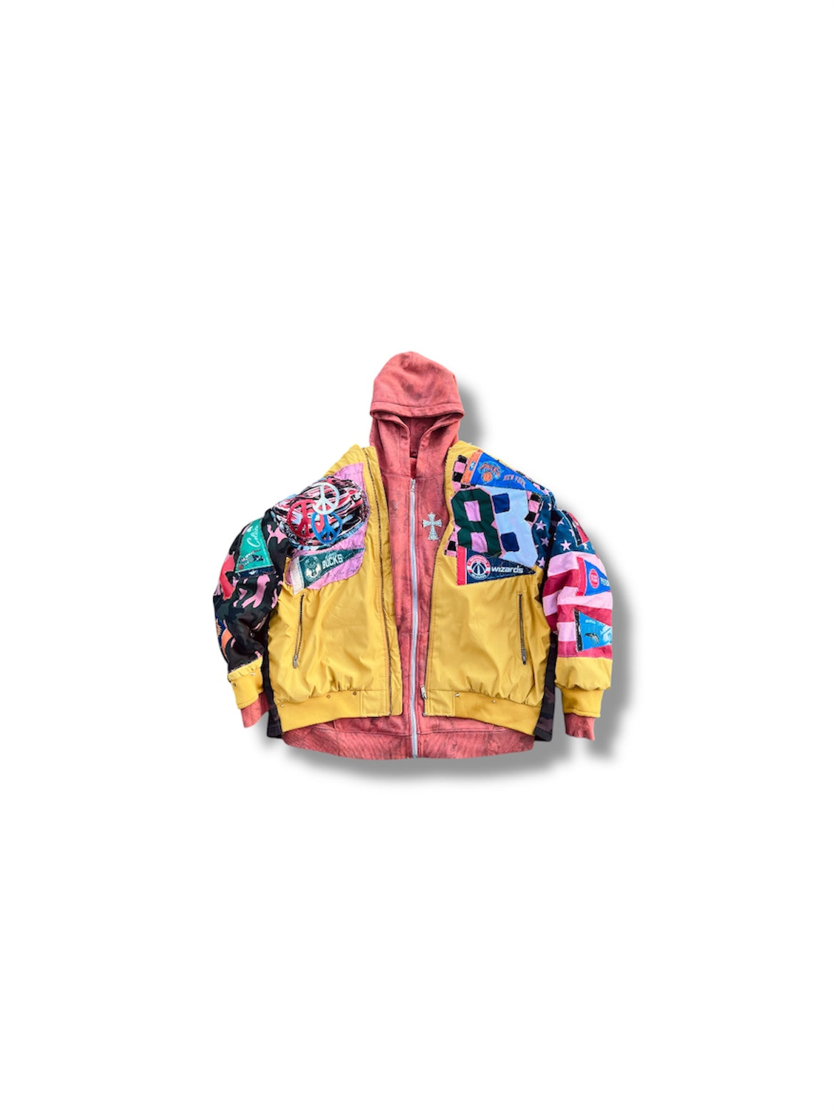 This one-of-one jacket is created by deconstructing a hoodie and a bomber jacket, then sewing them together into a single hybrid silhouette. The piece is finished with layered patchwork applied across the bomber body,