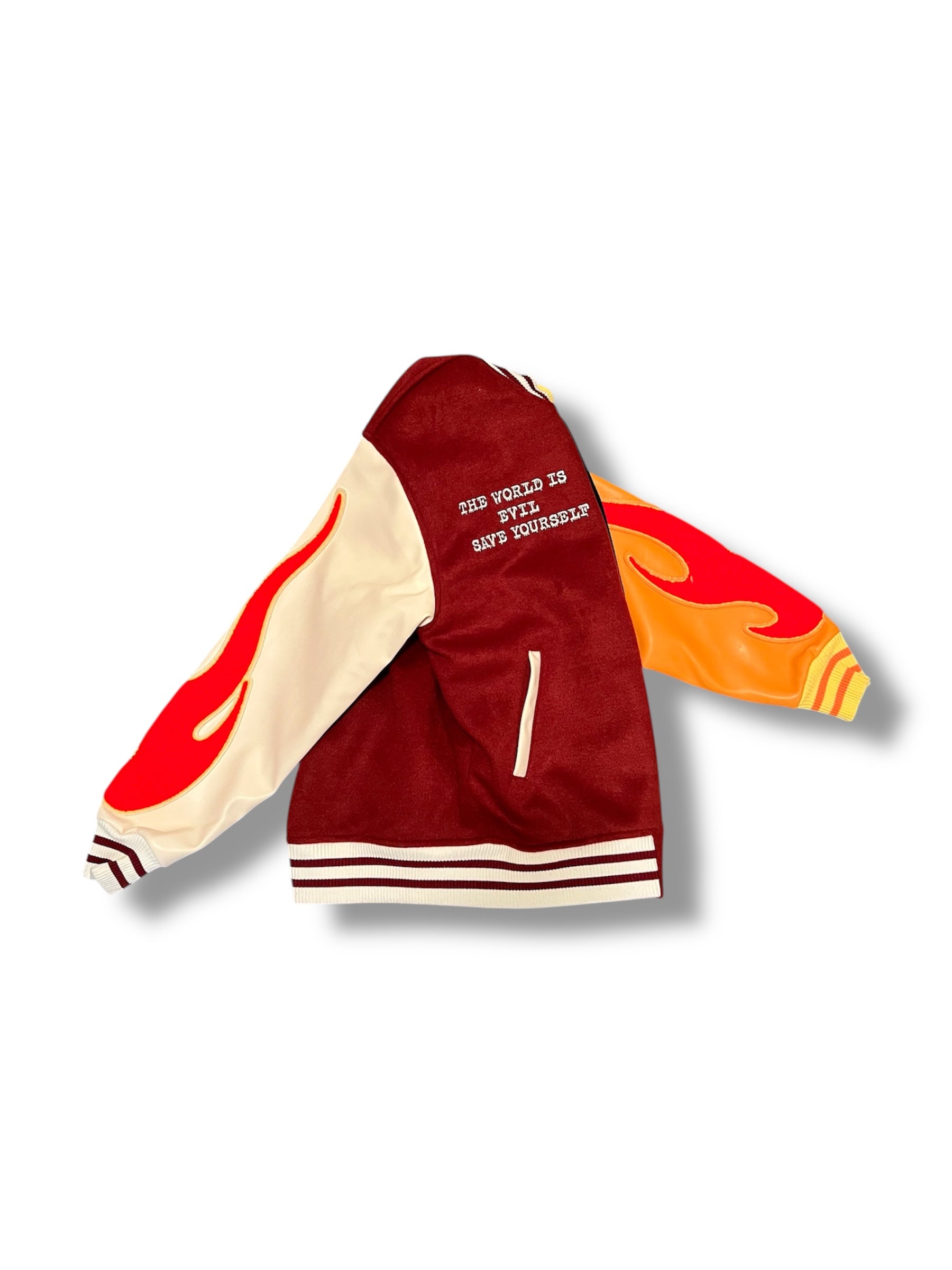 DOUBLE TONE BOMBER JACKET. WITH LEATHER SLEEVES. THIS JACKET REPRESENTS HOW THE WORLD CAN BE A CRUEL DISASTERS PLACE & WE ARE IN NEED TO SAVE OURSELF FROM IT. 1 SIDE IS BLACK WITH A ORANGE & YELLOW COLOR SCHEME THE OTHER IS BURGUNDY WITH CREAME COLOR SCHEME.