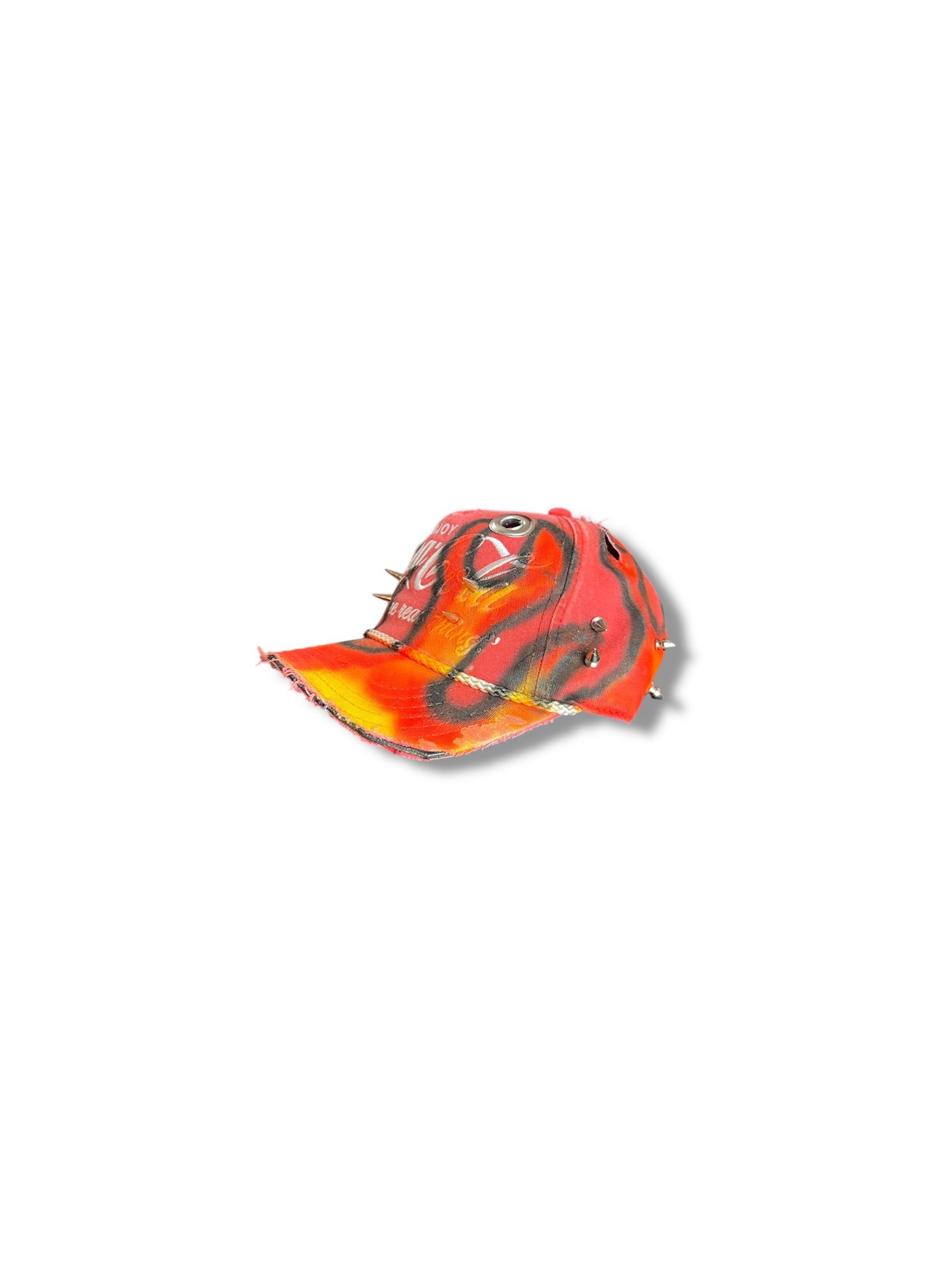 Hat created with raw free hand airbrushed spike distressed & eyelets. The concept behind this was to create a raw grunge headwear through sports & pop culture hats.. The creative process was for those who dress in alternative fashion or just simply like worn grunge distressed wear.