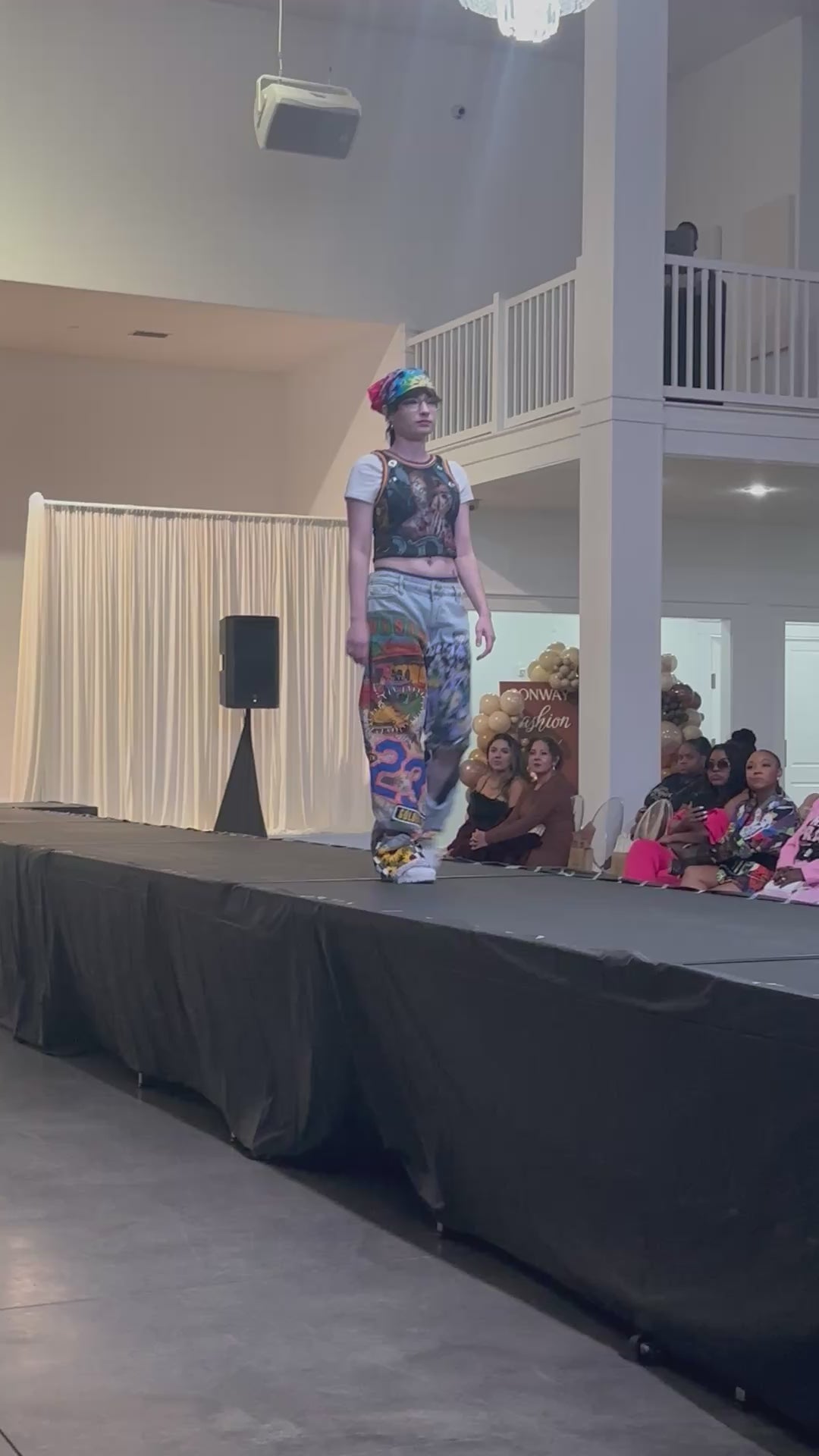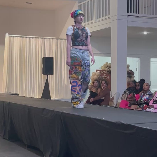 “DENIM CREATED FROM PATCH WORK ITEMS BASED AROUND SPORTS, ANIMIE, MOVIES, HIP-HOP, POP & PUNK ROCK CULTURE. JEWLS & OTHER EMBELLISHMENTS. DENIM VARYS IN STYLES FROM STRAIGHT LEG, FLARED, & BAGGY