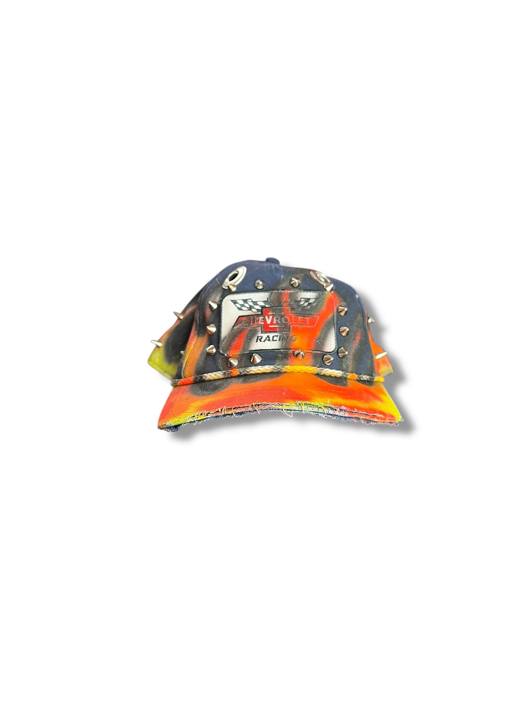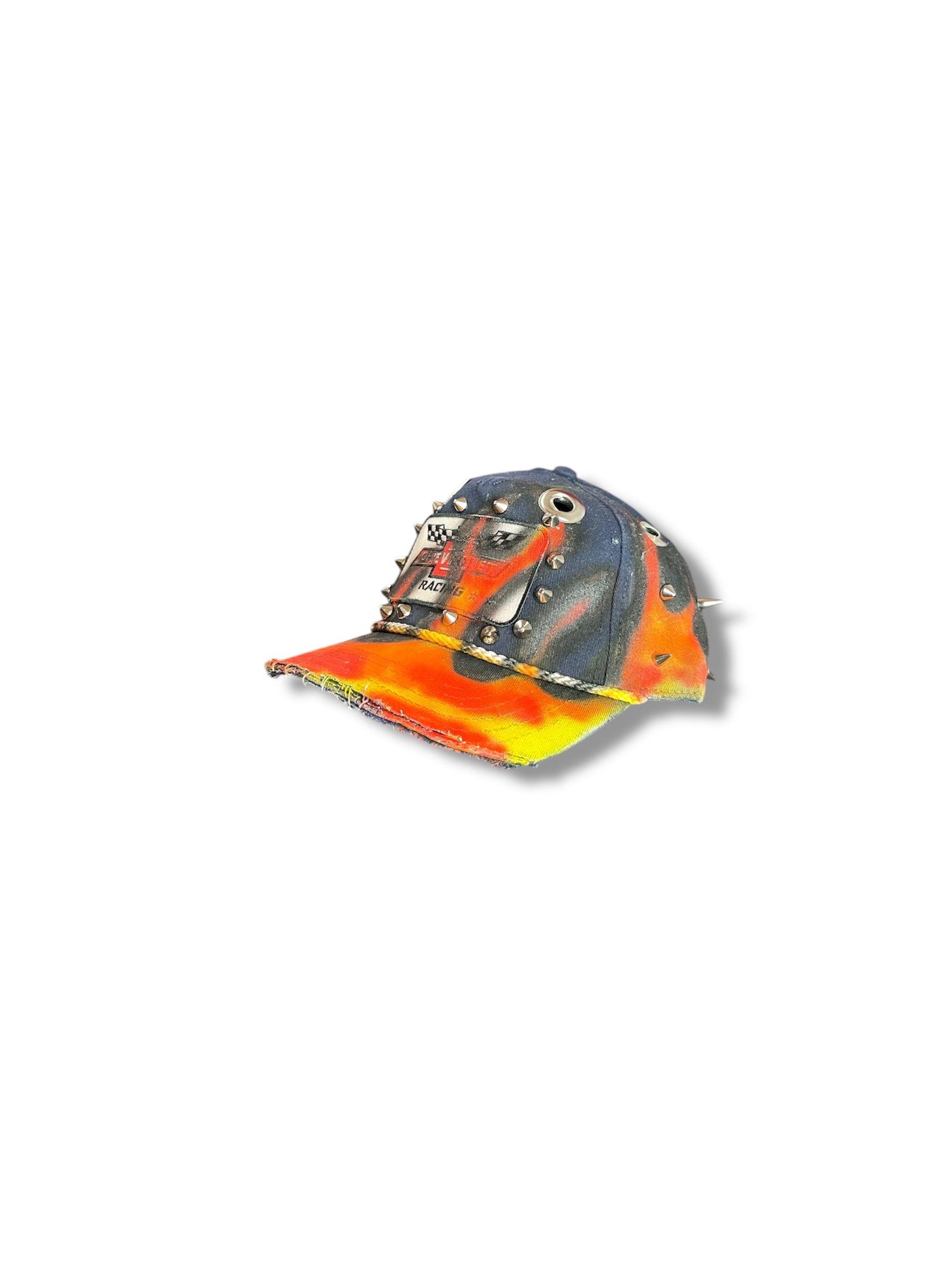 Hat created with raw free hand airbrushed spike distressed & eyelets. The concept behind this was to create a raw grunge headwear through sports & pop culture hats.. The creative process was for those who dress in alternative fashion or just simply like worn grunge distressed wear.