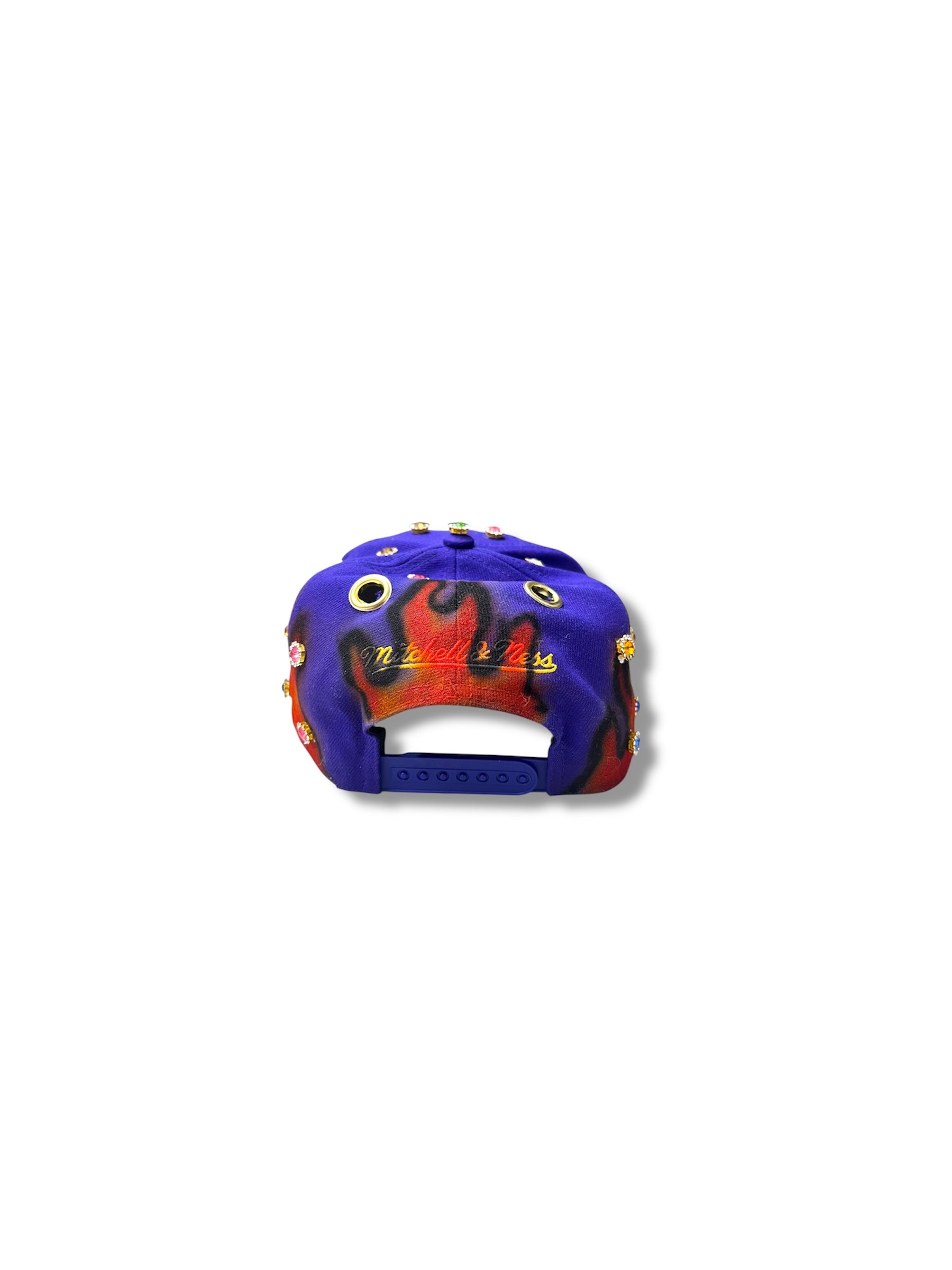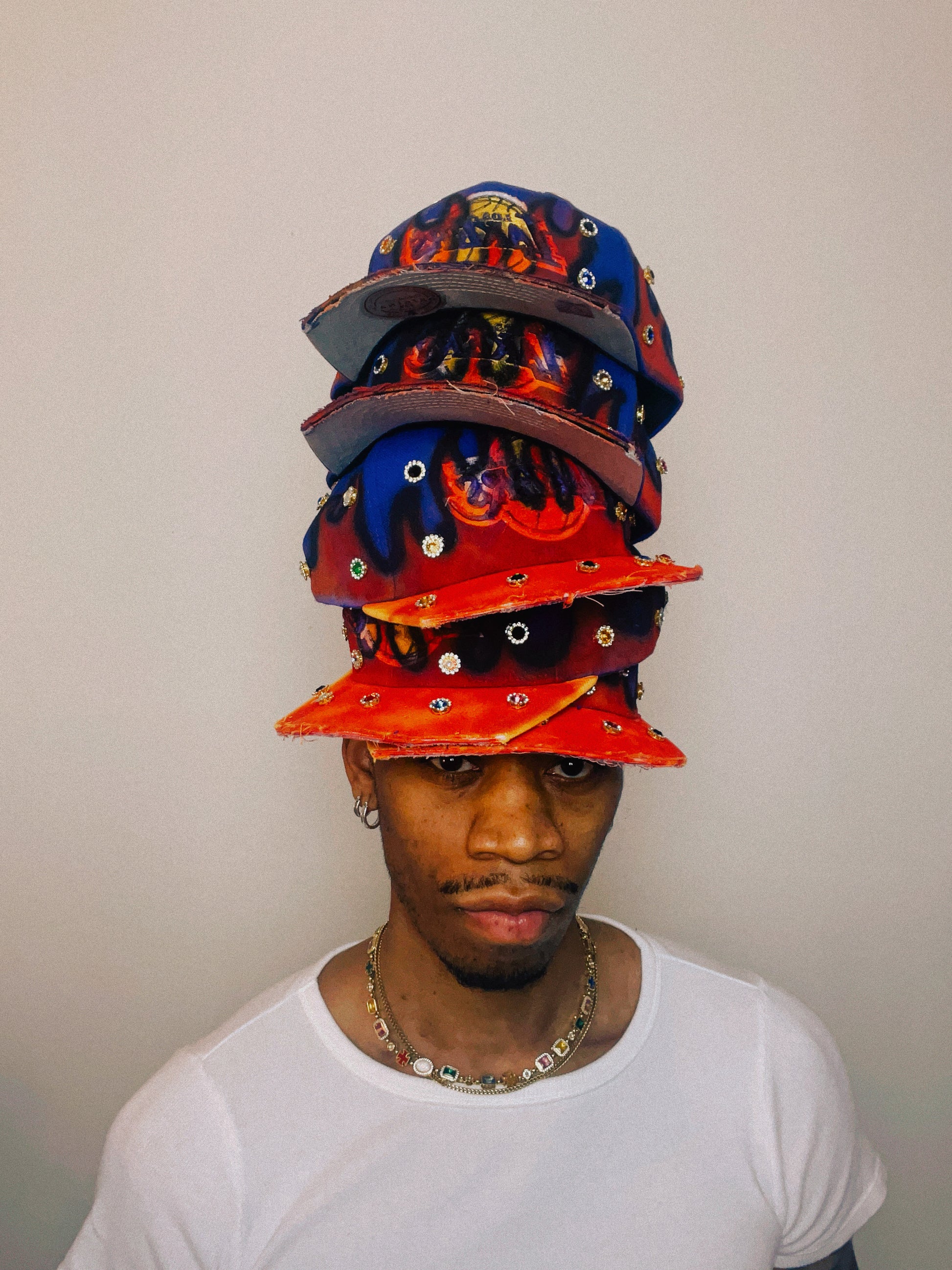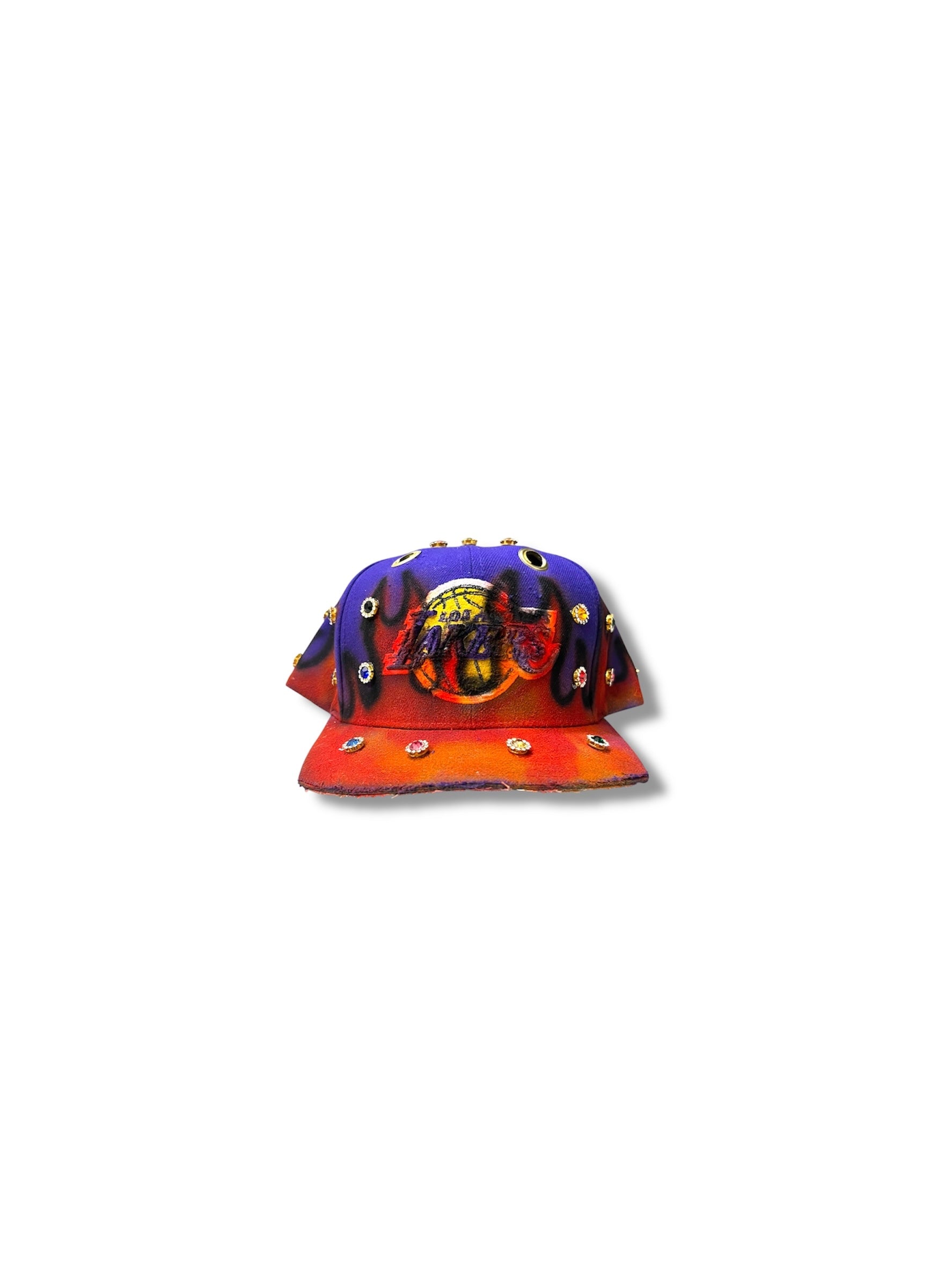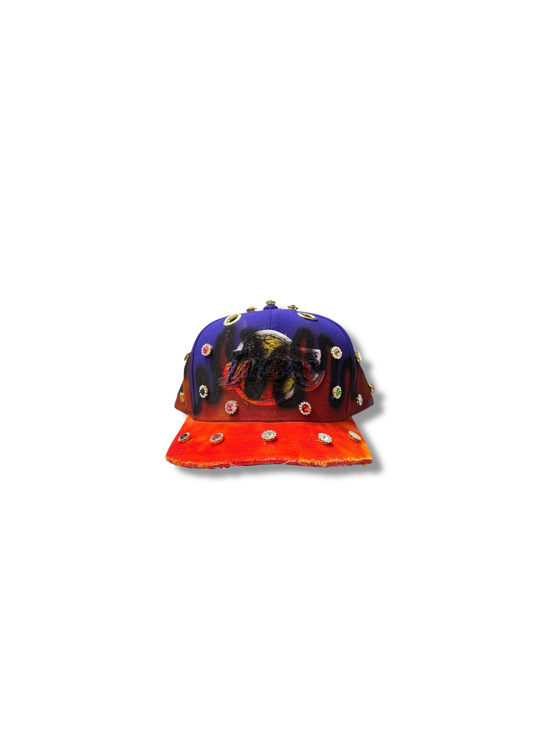 Hat created with raw free hand airbrushed spike distressed & eyelets. The concept behind this was to create a raw grunge headwear through sports & pop culture hats.. The creative process was for those who dress in alternative fashion or just simply like worn grunge distressed wear.