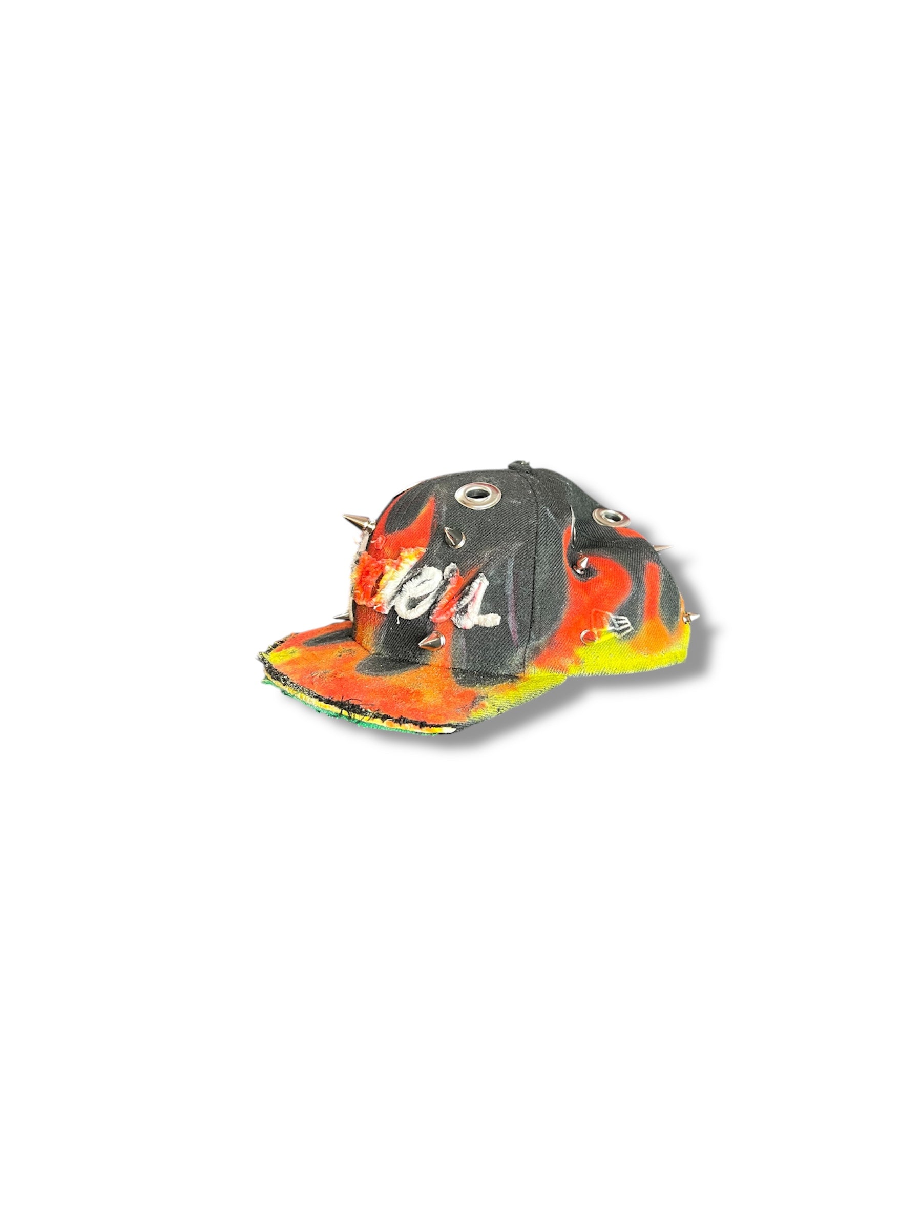 Hat created with raw free hand airbrushed spike distressed & eyelets. The concept behind this was to create a raw grunge headwear through sports & pop culture hats.. The creative process was for those who dress in alternative fashion or just simply like worn grunge distressed wear..