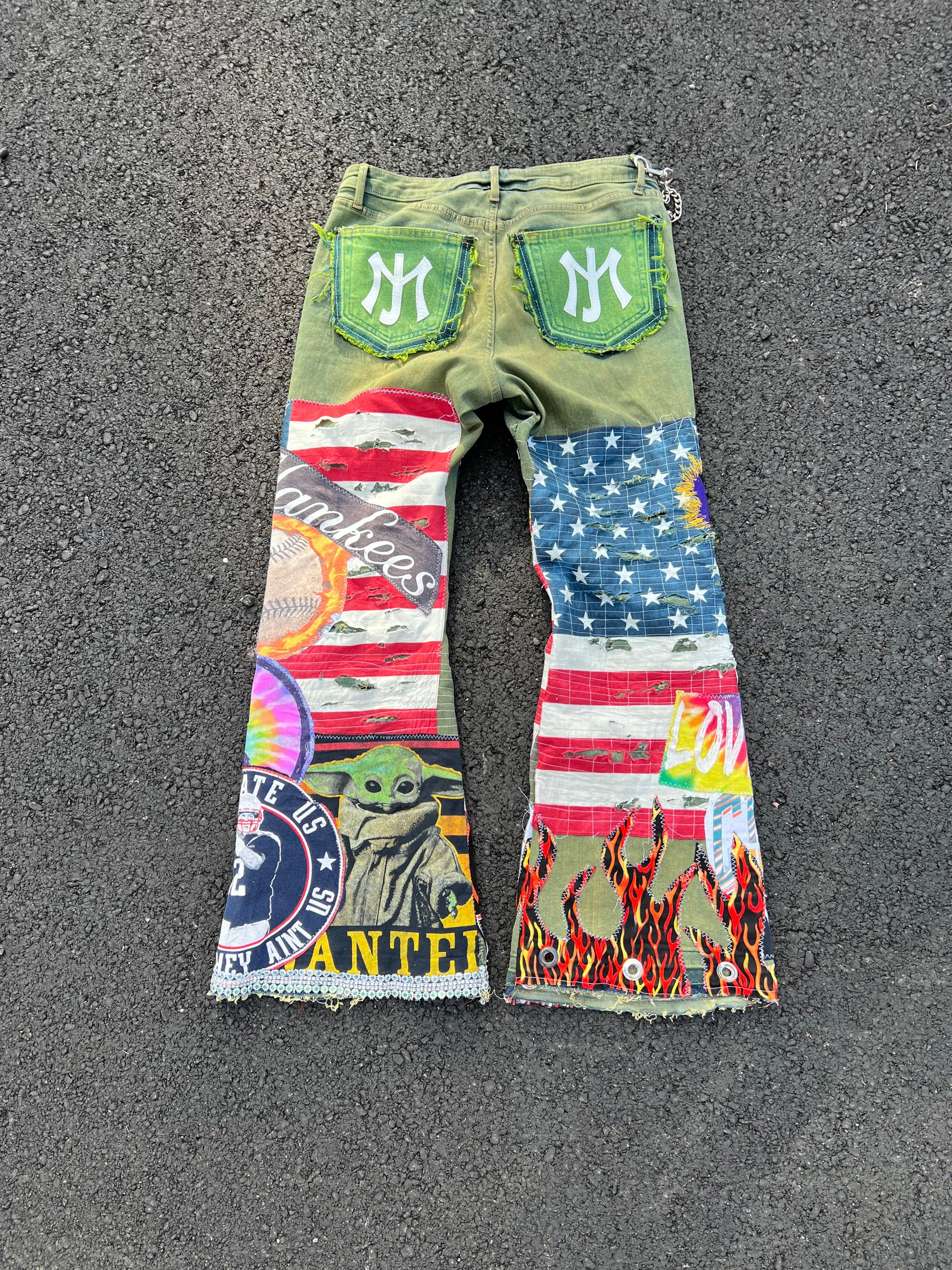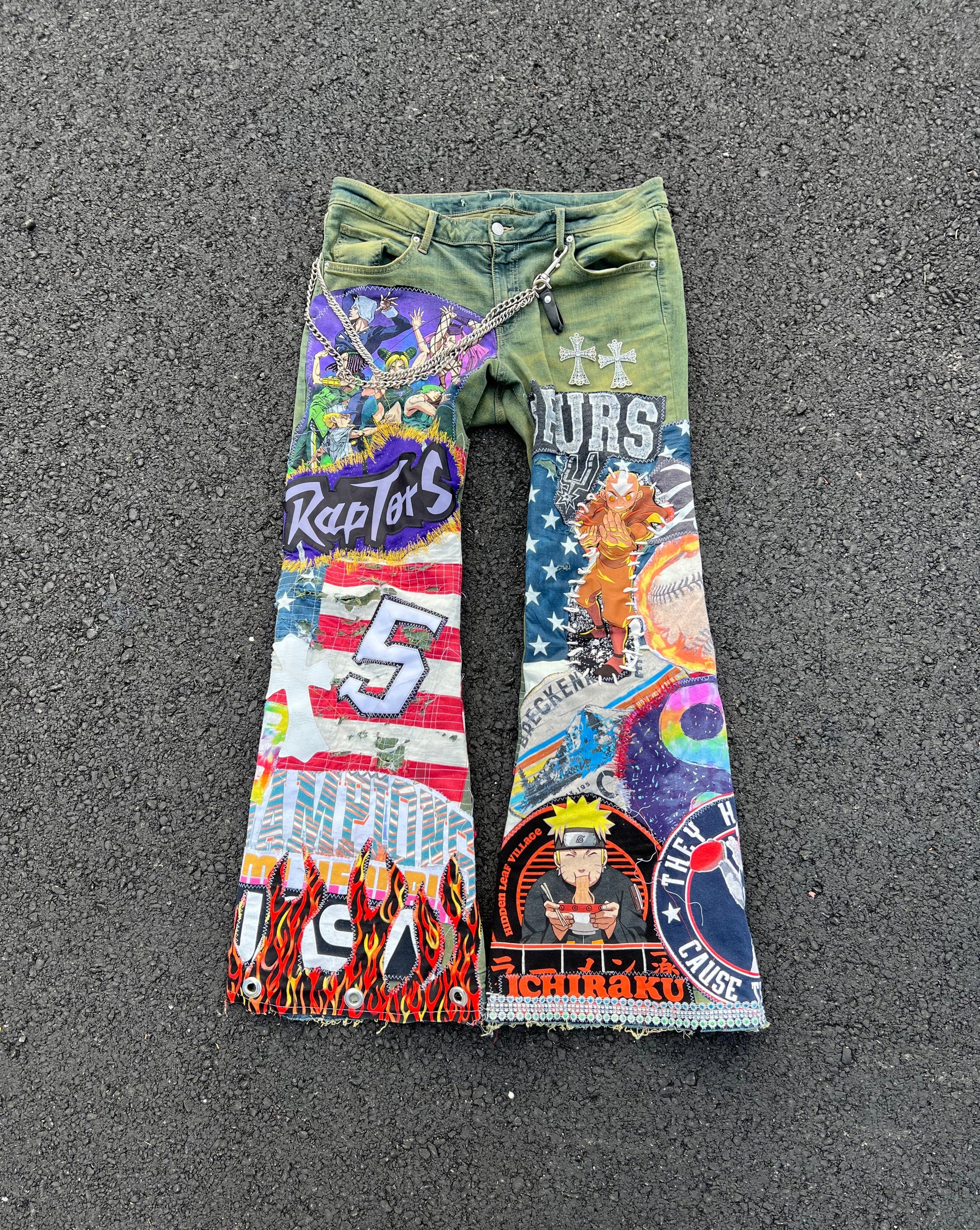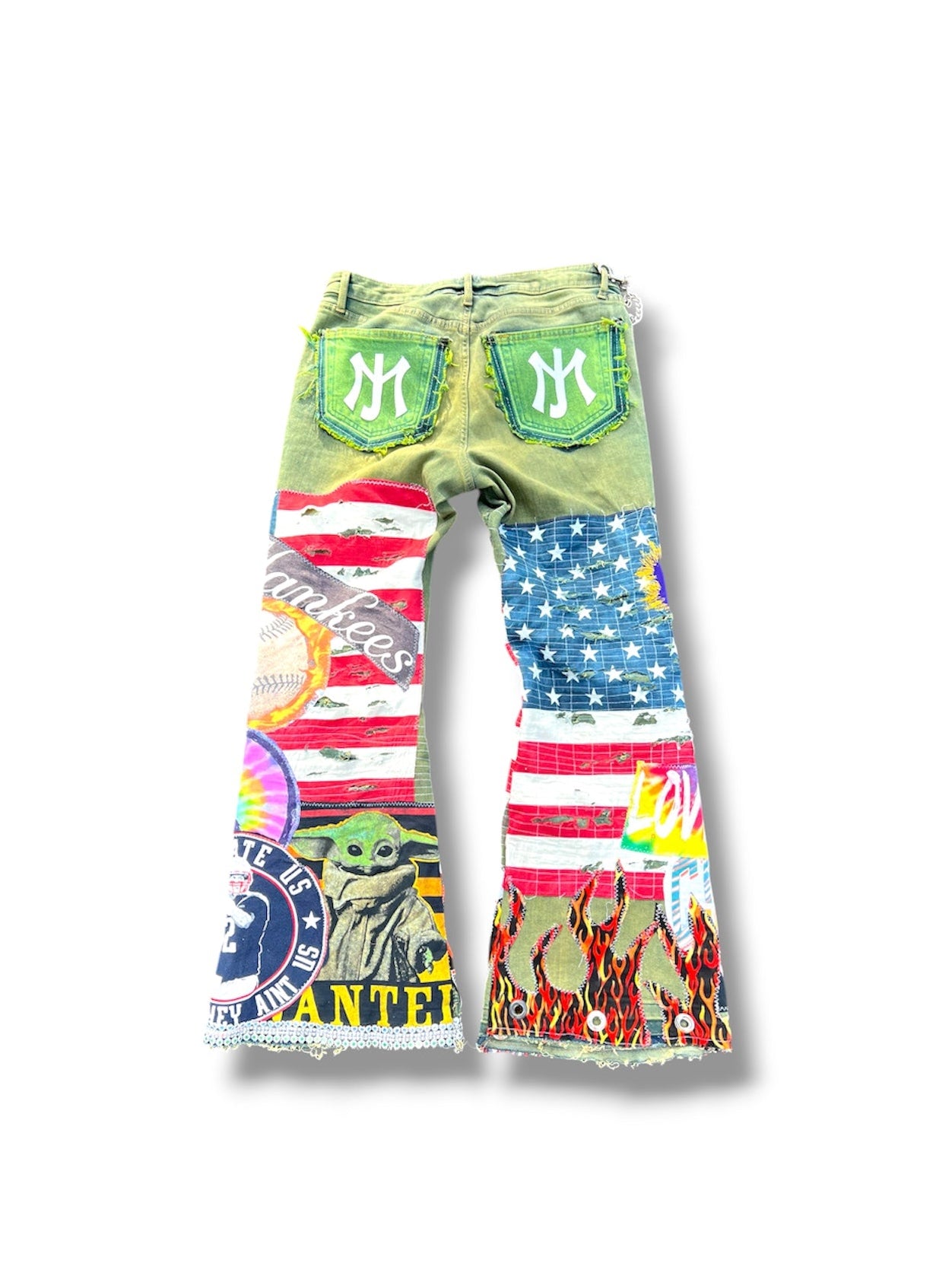 “HAND DYED GREEN DENIM THAT FEATURES AANG, SAN Antonio Spurs , Tom Brady , Multicolor yin yang , Toronto Raptors, Champion graphic Jimi Hendrix , Yoda , New York Yankees , Naruto, Free hand Accent color stitching, quilted distressed American flag jewel crosses, one leather cross, apple green dyed pocket Jayemade New York City inspired logo pocket. Flames & Embellished trim SLIM FLARED TO FIT.